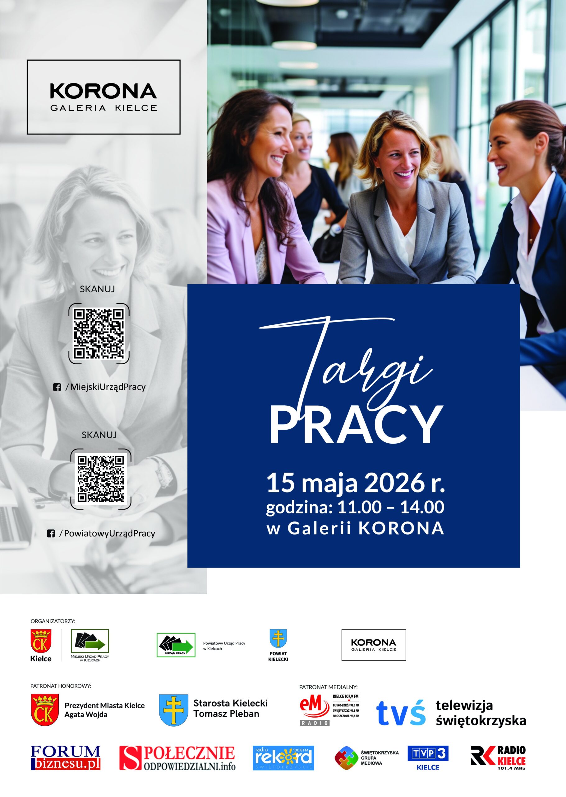 Miejski Urząd Pracy w Kielcach, Powiatowy Urząd Pracy w Kielcach oraz Galeria Korona serdecznie zapraszają osoby poszukujące zatrudnienia, a także wszystkich zainteresowanych zmianą pracy lub rozwojem zawodowym do udziału w Targach Pracy, które odbędą się w dniu 15 maja 2026 r. w godz. 11:00-14:00 w Galerii Korona w Kielcach.